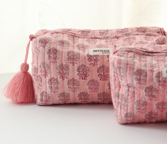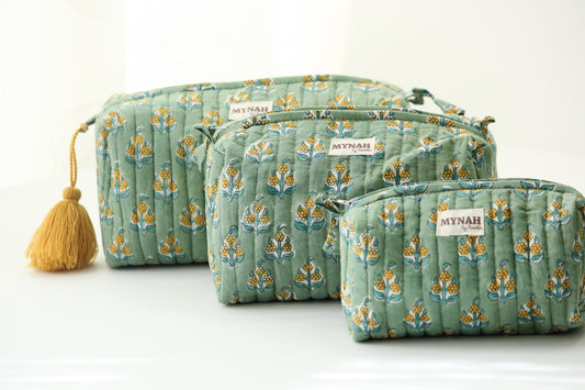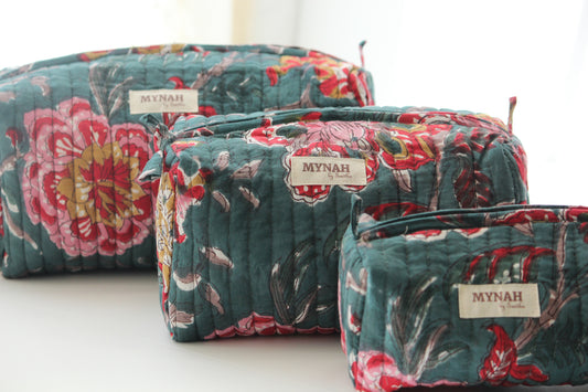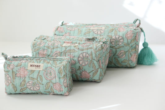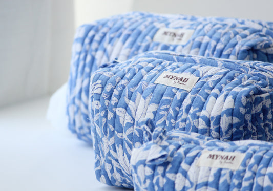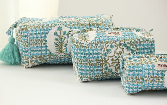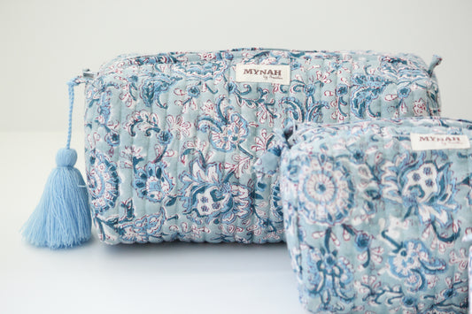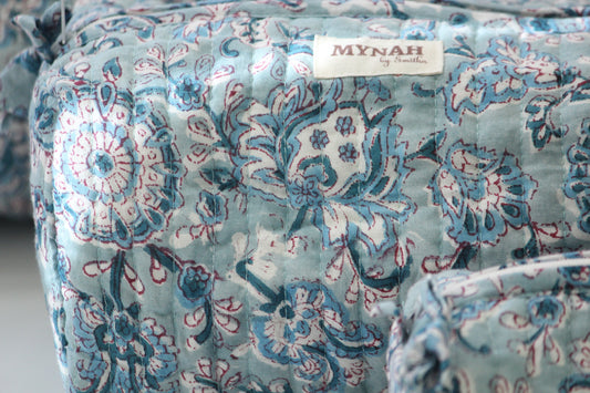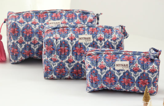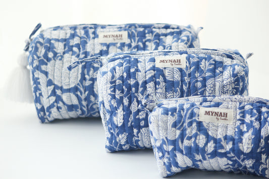 'DUSTY BLUE' hand block printed quilted travel/makeup zipper pouch-set of 3