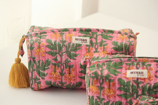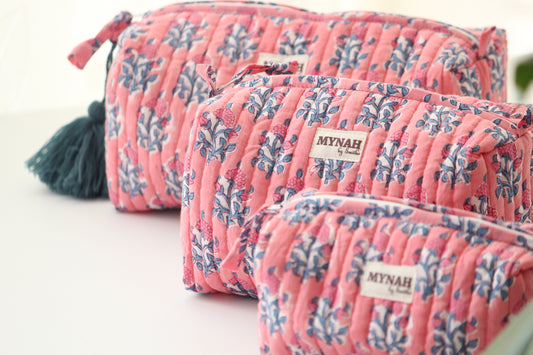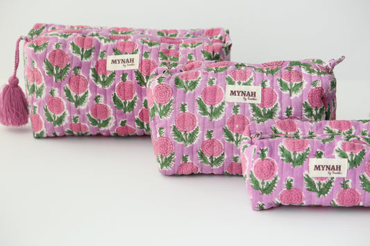 'BERRY SMOOTHIE' hand block printed, quilted travel/makeup zipper pouch-LARGE only