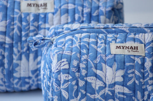 'DUSTY BLUE VINES' hand block printed, quilted travel/makeup zipper pouch-LARGE only