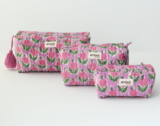 'DUSTY BLUE' hand block printed quilted travel/makeup zipper pouch-set of 3